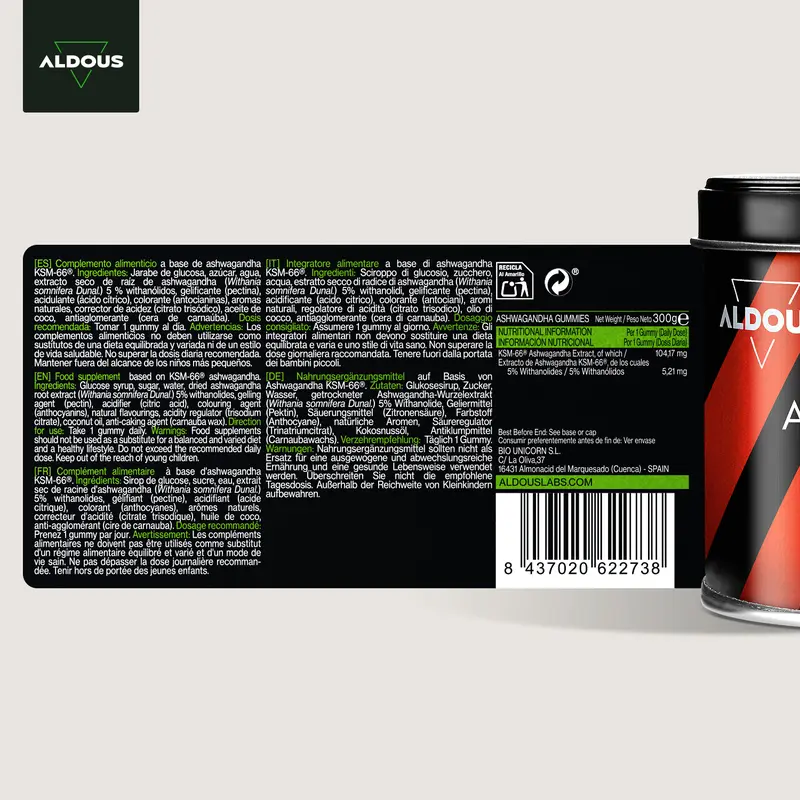 • 💫 GOMINOLAS ASHWAGANDHA KSM-66 ESPECTRO COMPLETO – Las ashwagandha gominolas Aldous promueven el bienestar físico y mental. Cada gominola tiene sabor natural a cereza y al sabor característico de la ashwagandha. Cada gominola contiene 104,17mg de extracto de Ashwagandha ksm-66 de la india de calidad premium. El extracto KSM-66 tiene una concentración mas alta que los demás extractos de ashwagandha polvo sin ksm66 que añaden las hojas de la planta al extracto y son de más baja concentración.